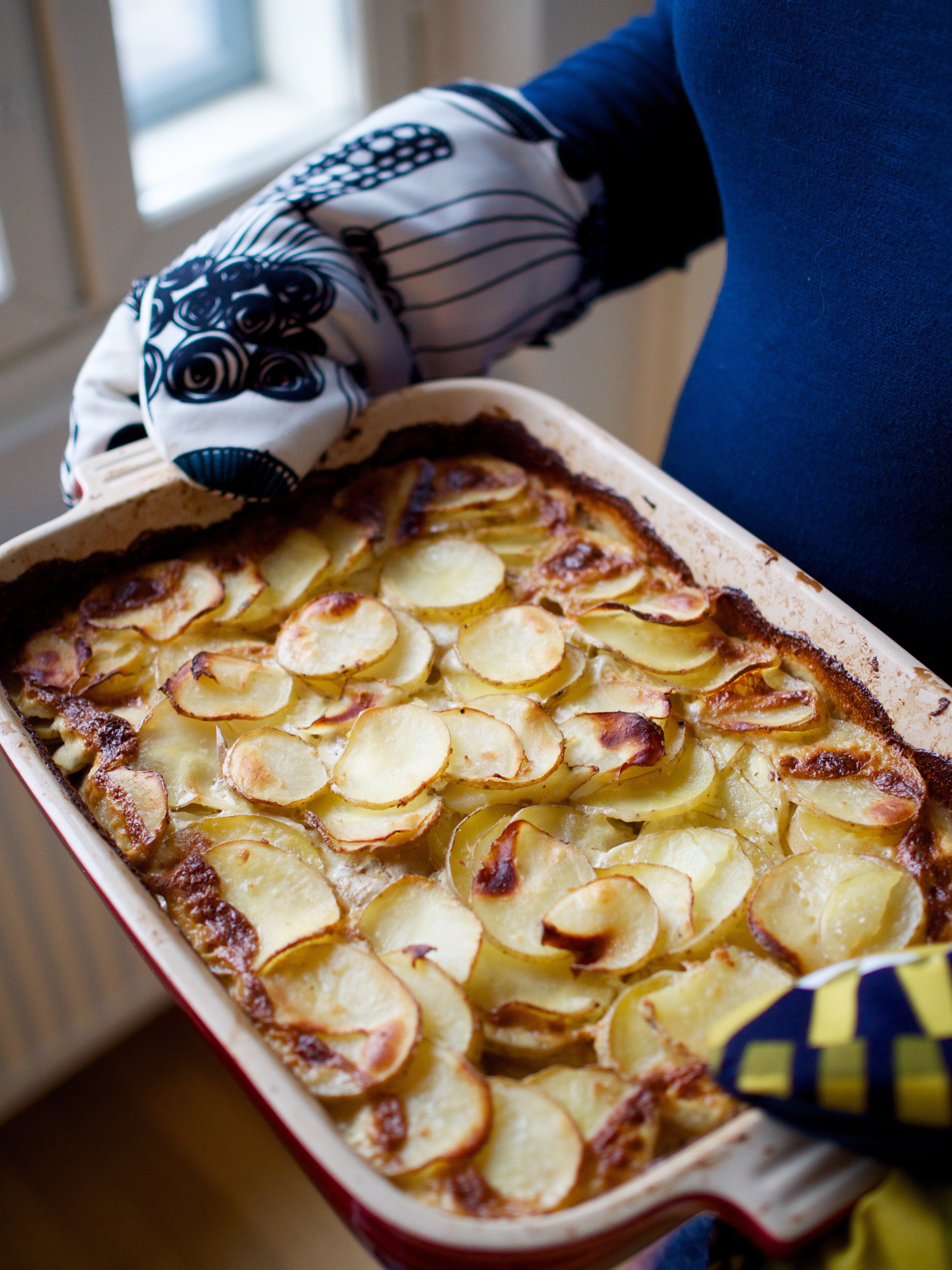 Tosiasiassa suloiselta kuulostava pommes dauphnoise on vastine kotoisille kermaperunoille, melkein. Perunat höylätään ohuiksi, lähes läpikuultaviksi siivuiksi, jotka ladotaan kauniiksi kerroksiksi uunivuokaan ja hukutetaan muskottipähkinällä maustettuun kermaan. Itse maustan kerman piparjuurella, se antaa kivaa raikkautta perunoihin.