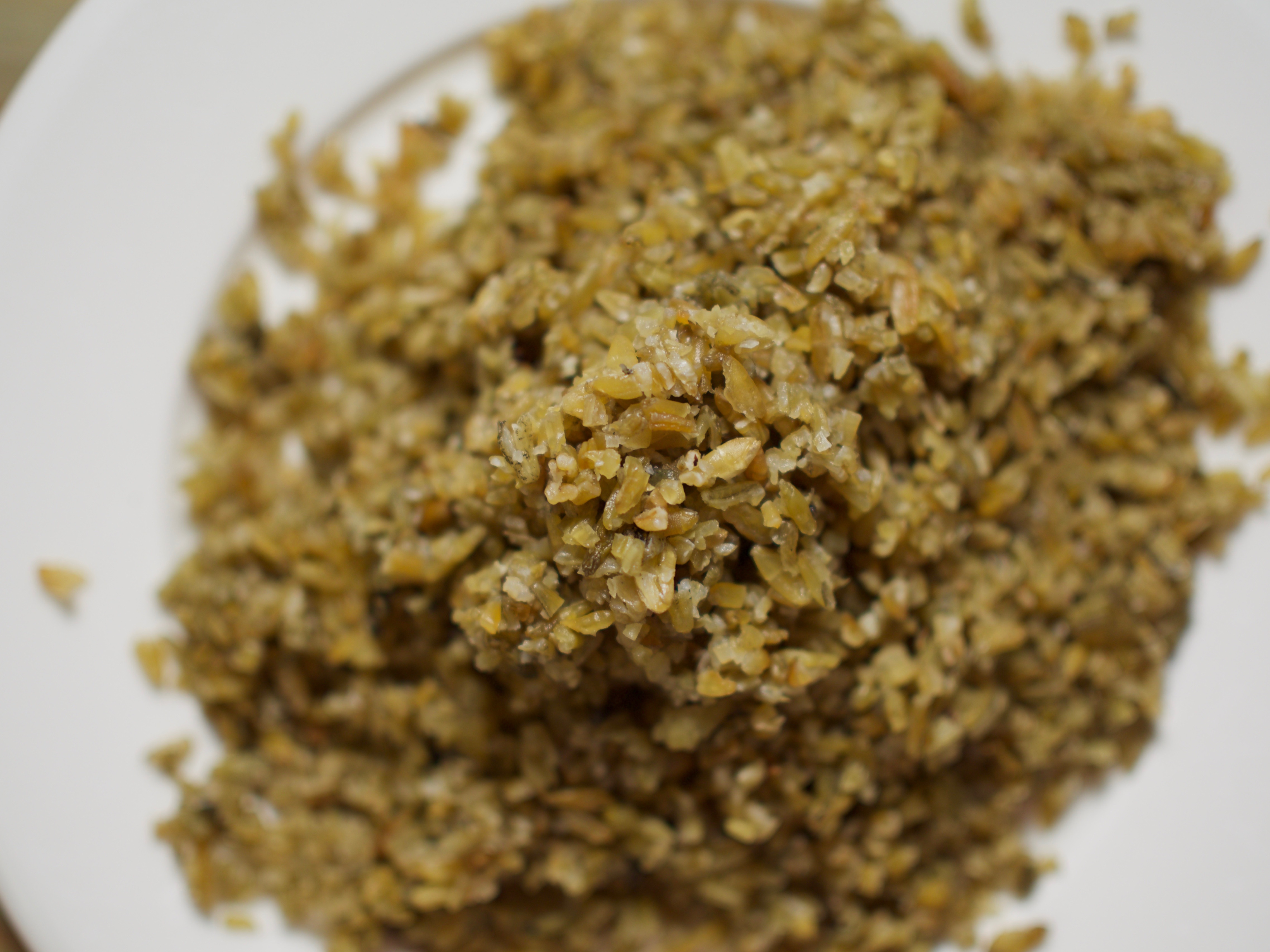 Lisäkkeeksi tein freekehistä ja bulgurista salaatin, johon lisäsin vain tuoreita yrttejä, korianteria, minttua, lehtipersiljaa, sekä pistaasia rouhittuna. Kastikkeen pyöräytin pistaasiöljystä ja veriappelsiininmehusta. Freekeh on varmasti monille vielä uusi tuttavuus. Se on vihreänä poimittua vehnää, joka savustetaan, joten siinä on miedon savuinen maku. Freekehiä on mahdollisuus hankkia K-ruokakauppojen kautta. Minulla oli vielä Englannista tilaamaani freekehiä pussin pohjallinen ja se ei oikein yksistään riittänyt, joten lisäsin vielä vähän bulguria mukaan. Salaatin lisäksi paahdoin uunissa kokonaisia munakoisoja, kunnes ne olivat aivan ruttuisia ja lytyssä. Sisus kaavittiin pois, soseutettiin ja maustettiin sitruunalla, suolalla ja pippurilla. Yksinkertaista ja hyvää!
