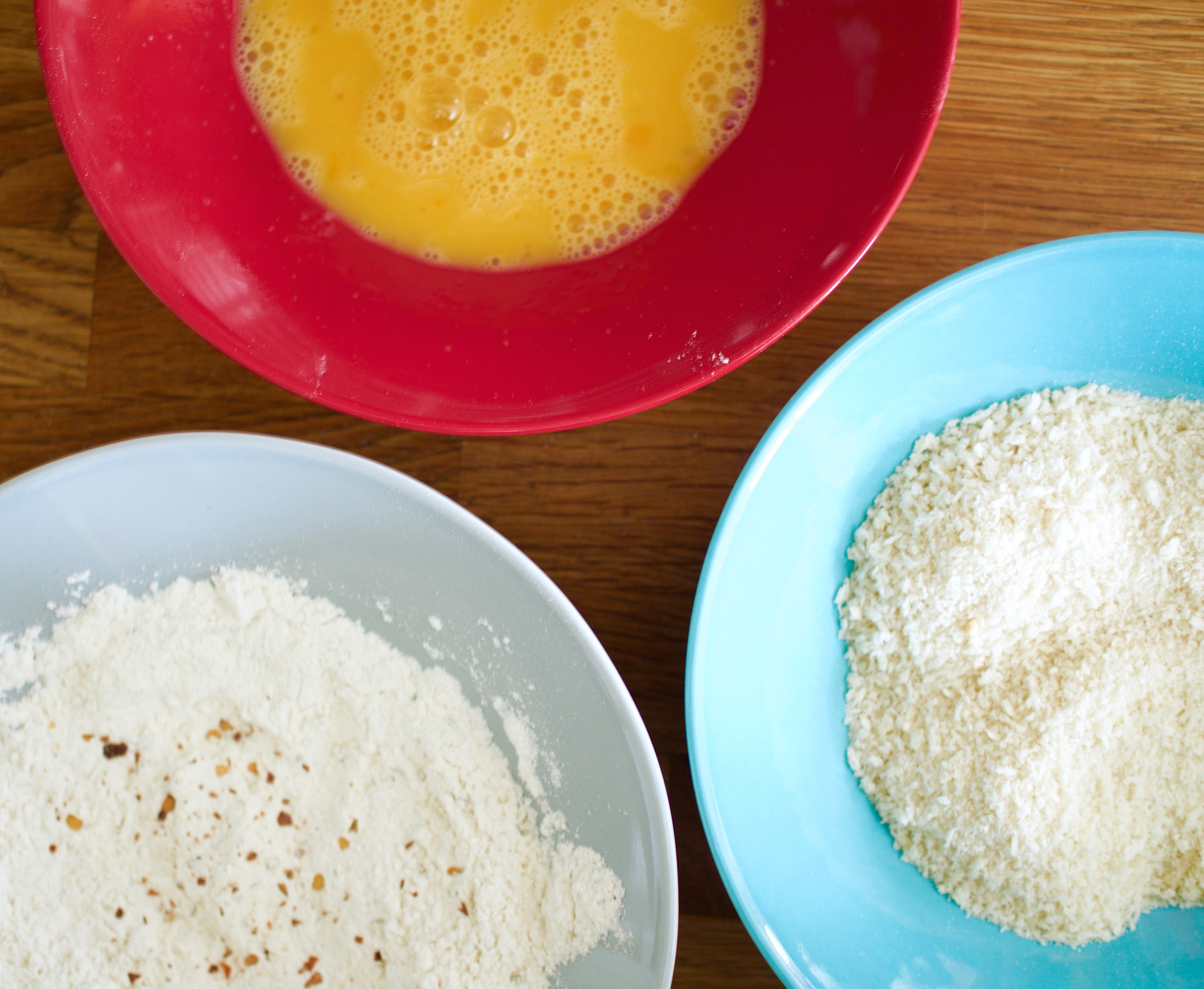 vehnäjauhoja, 2 kananmunaa, japanilaisia pankojauhoja tai itsetehtyjä rouheita korppujauhoja, 2 tl sitruunatimjamia (tavallinen kuivattu käy myös, lisää silloin yhden sitruunan raastettu kuori), 1 tl suolaa, pari rouhaisua mustapippuria myllystä, ripaus chilirouhetta