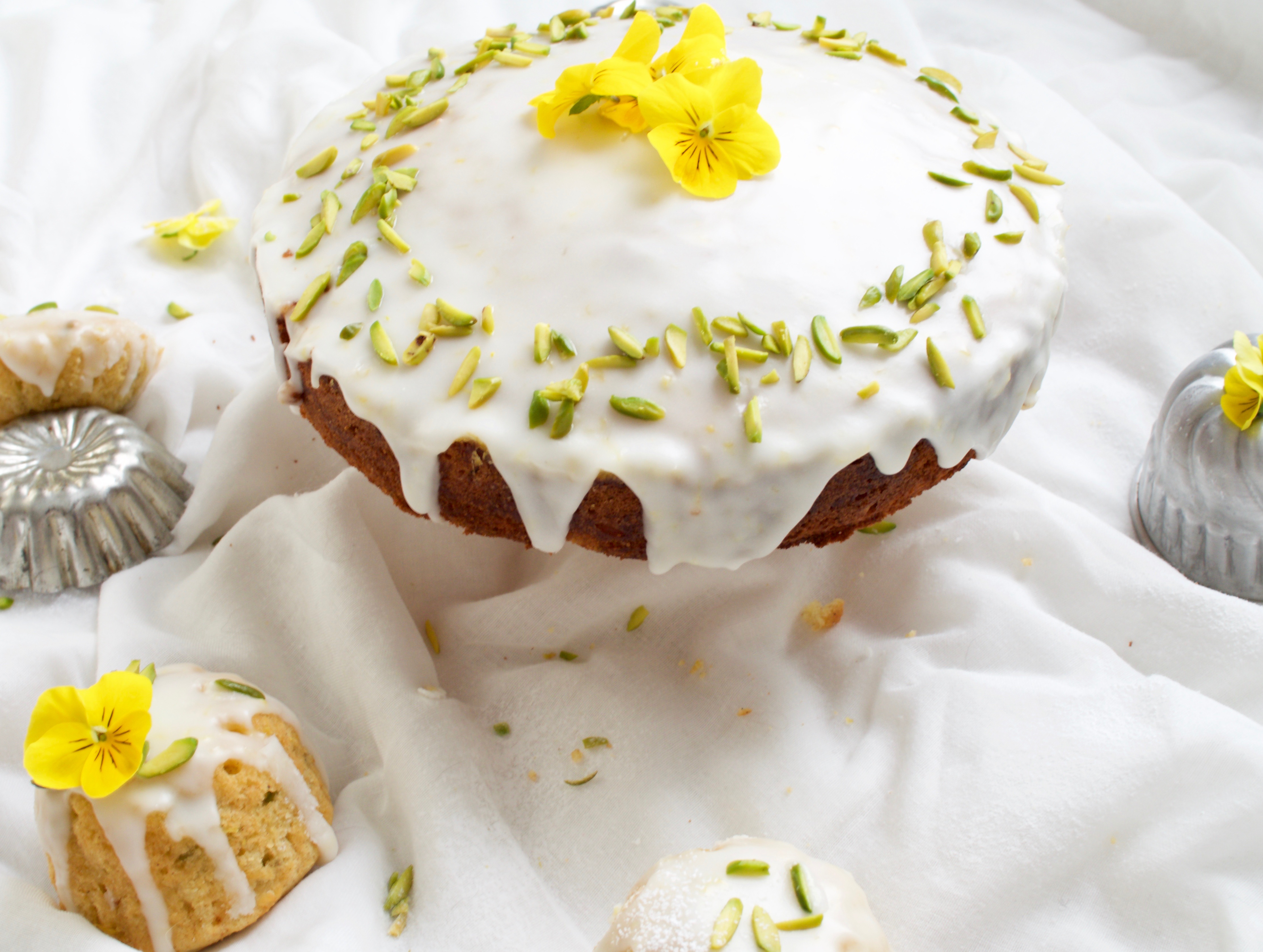 Tämän suorastaan hurmoshenkisen alun jälkeen on syytä siirtyä itse asiaan. Sitruunaisen kakun ohje on synteesi Jamie Oliverin ja Delia Smithin (jep, juurikin SE Delia) sitruuna-unikonsiemenkakuista. Hieman ehkä yllättäen Jamien mummon kakkuohje osoittautui testauksessa paremmaksi, joten vaihdoin siitä ohjeesta ainoastaan unikonsiemenet pistaaseihin. Delia puolestaan tarjosi raikkaamman sitruskostutuksen kakulle. Delian ohjeessa sokerit sekoitetaan sitruunamehun ja raastetun sitruunan kuoren joukkoon. Jamien ohjeessa sen sijaan sitruunamehu ja sokeri keitetään siirapiksi, jolloin sitruunan tuli hiukan tympeä maku. Voi toki olla, että oma siirappini ehti hiukkasen liian kauan kiehua ja maku johtuu siitä.