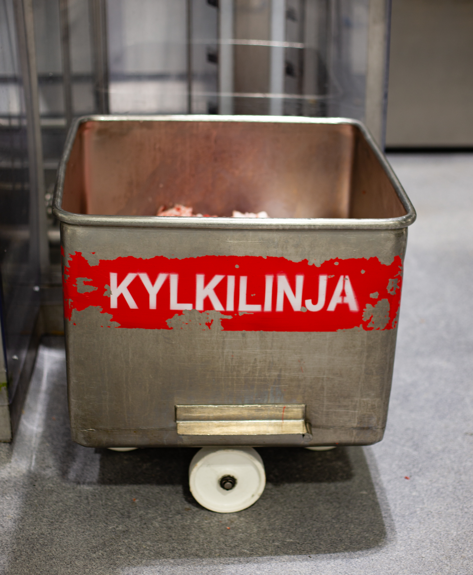 Tehdaskierros oli todella mielenkiintoinen ja pääsimme katsomaan ruhojen paloittelua ihan vierestä. Minulle oli yllätys kuinka iso osa paloittelusta edelleen tehdään käsityönä. Toki osa paloittelusta tapahtui koneellisesti robottien avulla, mutta todella moni vaihe tehtiin käsin. Työ on raskasta ja Markku kertoikin, että lihanleikkaajaksi hakevan täytyy selvitä kuntotestistä vähintään arvosanalla 3 (asteikko 1-5). Pelkkä raaka voima ei yksistään tietysti riitä, vaan lihanleikkaajalla täytyy olla myös hienomotoriikka kunnossa. Ammattitaitoisten lihanleikkaajien löytäminen ei helppoa ja Atriallakin on jatkuvassa koulutuksessa työntekijöitä tätä varten. Koulutuksesta pääsee läpi tosin vain murto-osa.