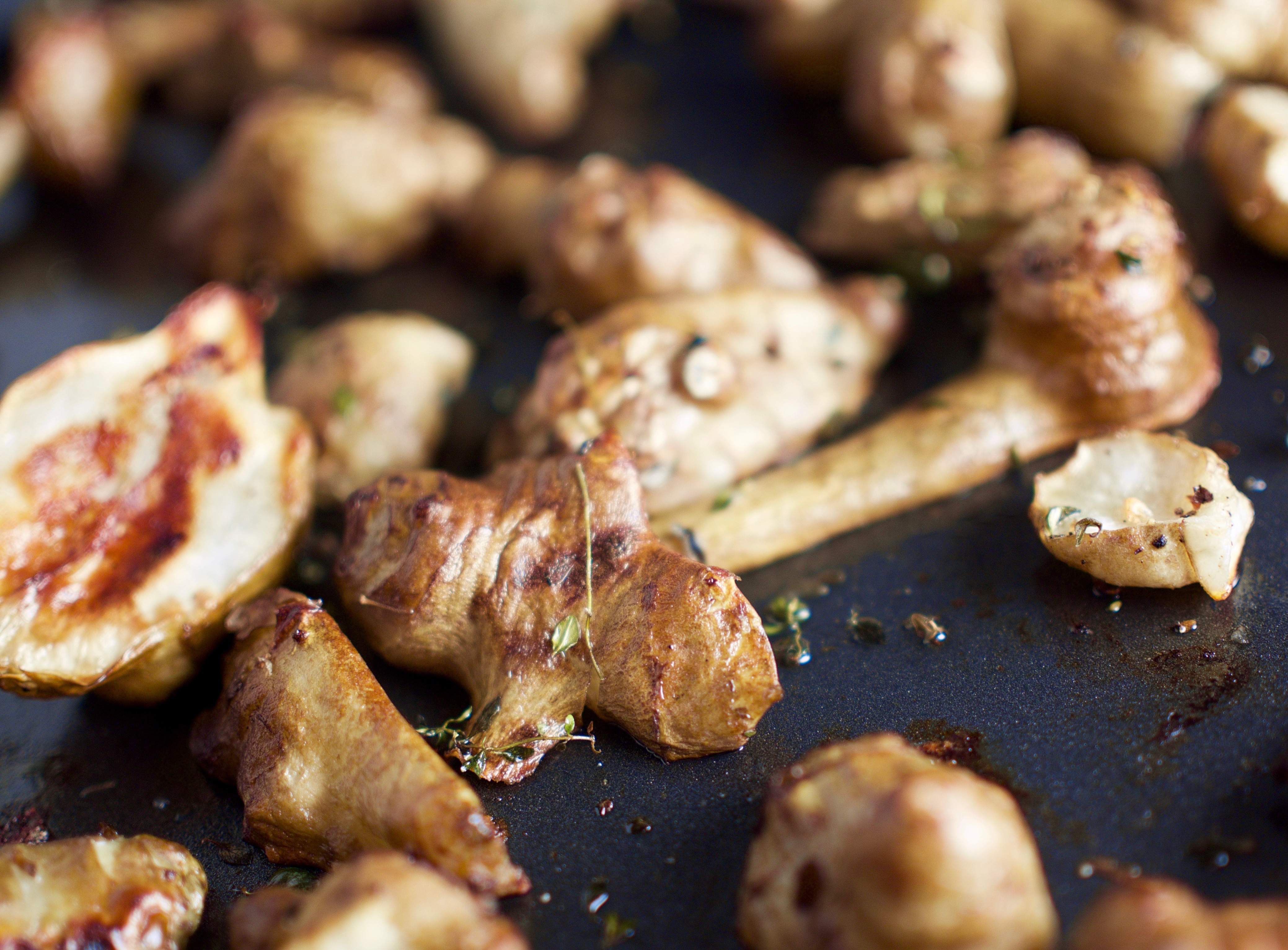Pese maa-artisokat huolellisesti ja leikkaa ne puoliksi. Pyörittele maa-artisokat suolalla ja pippurilla maustetussa öljyssä. Levitä artisokat tasaisesti uunipellille ja ripottele pellille haluamasi määrä timjaminoksia. Paista uunissa 200 asteessa noin 25 minuuttia riippuen maa-artisokkien koosta.